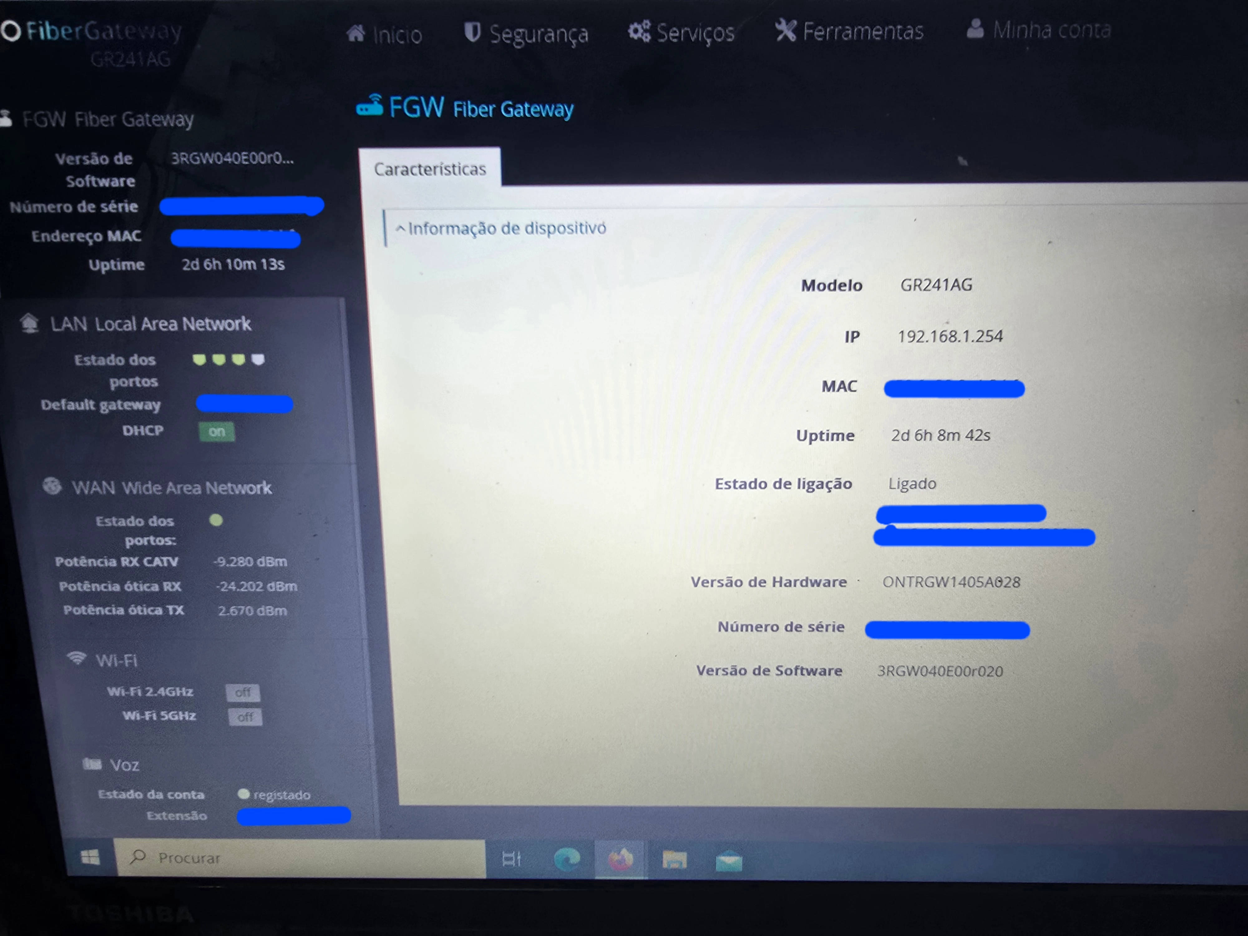 Para vossa referência, em anexo segue uma captura de ecrã da página de gestão do router que demonstra que os valores óticos (sinal de fibra) estão dentro dos parâmetros normais (RX: -24.202 dBm; TX: 2.670 dBm). Isto prova que a linha física de fibra no exterior está OK e que a falha reside exclusivamente no vosso equipamento.