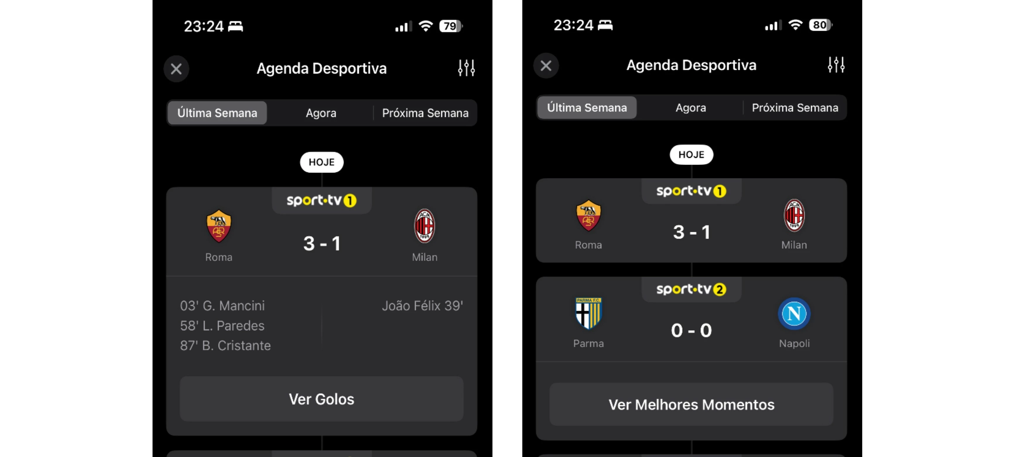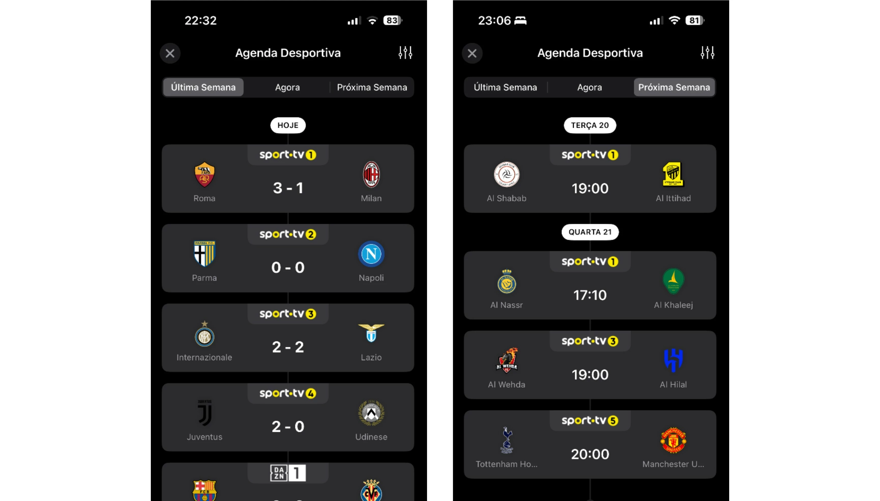 Nota: A agenda desportiva no smartphone é focada em jogos de futebol, enquanto no tablet a lista é mais vasta e inclui também outros desportos, como por exemplo o ténis.