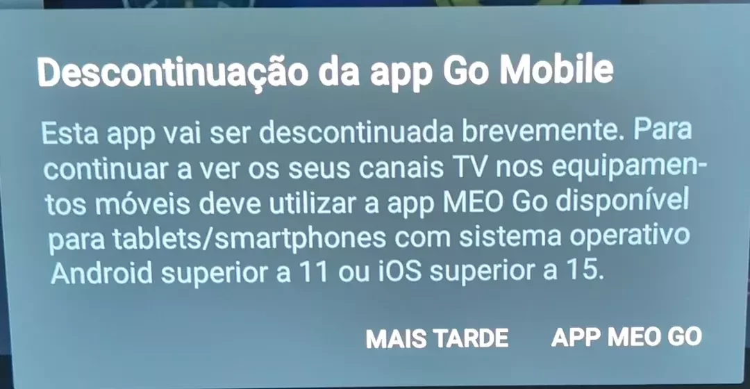 Não sei se alguém me poderá ajudar, mas eu tenho uma Amazon Firestick e tenho o serviço MeoGo fora de casa, mas procurando na store da amazon não encontrei a app e então fiz a instalação da app via downloader e tem funcionado bem. Instalei a versão Go Mobile - v3.26.0 (foi a versão compatível recomendada por aqui) mas recentemente comecei a receber este aviso, ao clicar no App MeoGo não abre nada.