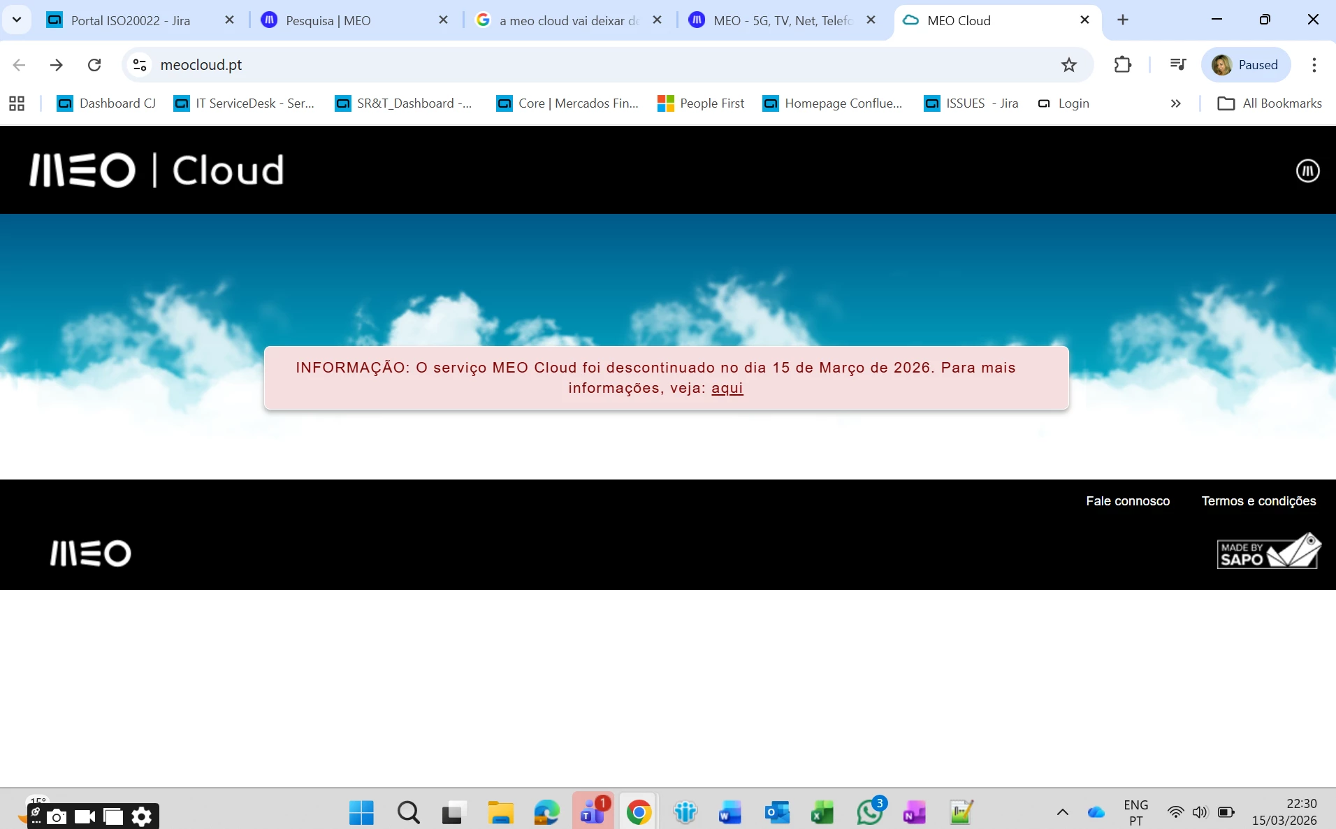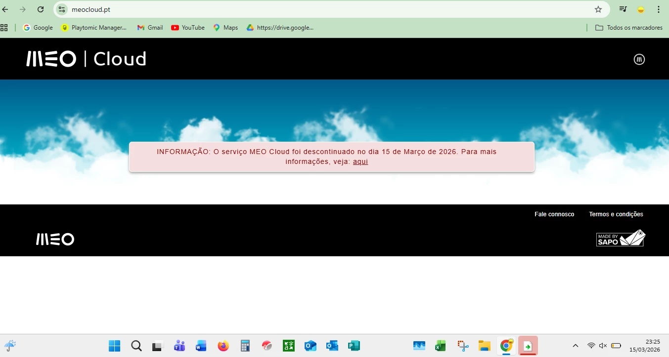 O serviço MEO Cloud será descontinuado no dia 15 de março de 2026. Para garantir que não perde os seus conteúdos, deve fazer o download de todos os ficheiros ou outros conteúdos para um dispositivo local antes dessa data. Após 15 de março, todos os conteúdos serão eliminados permanentemente e não será possível recuperá-los, nem aceder à conta MEO Cloud.