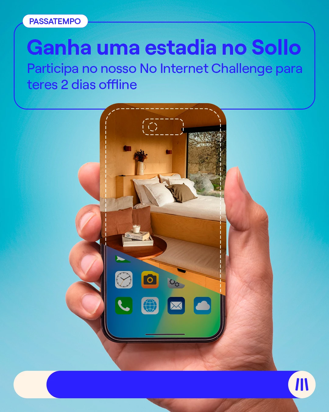 Até dia 7 de outubro, participa neste passatempo comentando nas redes sociais do MEO o que farias para passar o tempo se ficasses sem internet durante 48h. A resposta mais criativa ganha 1 estadia de 2 noites para 2 pessoas no Sollo!