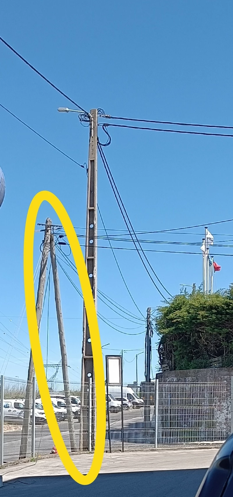 Existe um poste de madeira MEO que está em vias de cair, está partido e encostado a outo poste , na Avenida das indústrias, Colaride (na esquina com a rua António Alves de Azevedo, 2735-213 Agualva-Cacém.