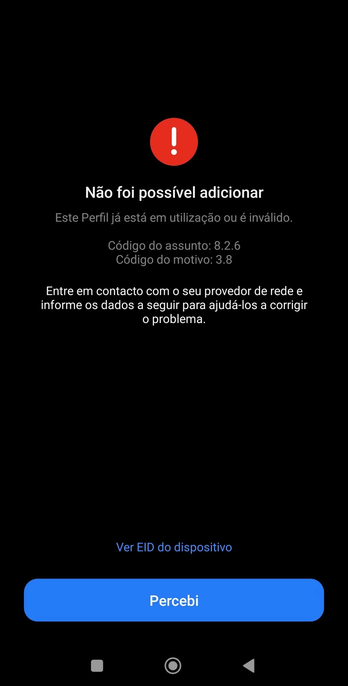 Fiz recentemente a portabilidade de um número de outro operador, com pedido de eSim. Ora quando tento que o telefone adicione, obtenho erro, conforme imagem anexada, que diz perfil inválido ou em uso. De referir que o eSim foi feito tentativa de adicionar conforme instruções no e-mail da portabilidade. Gostaria de saber o que posso fazer, pois este número está sem cartão.