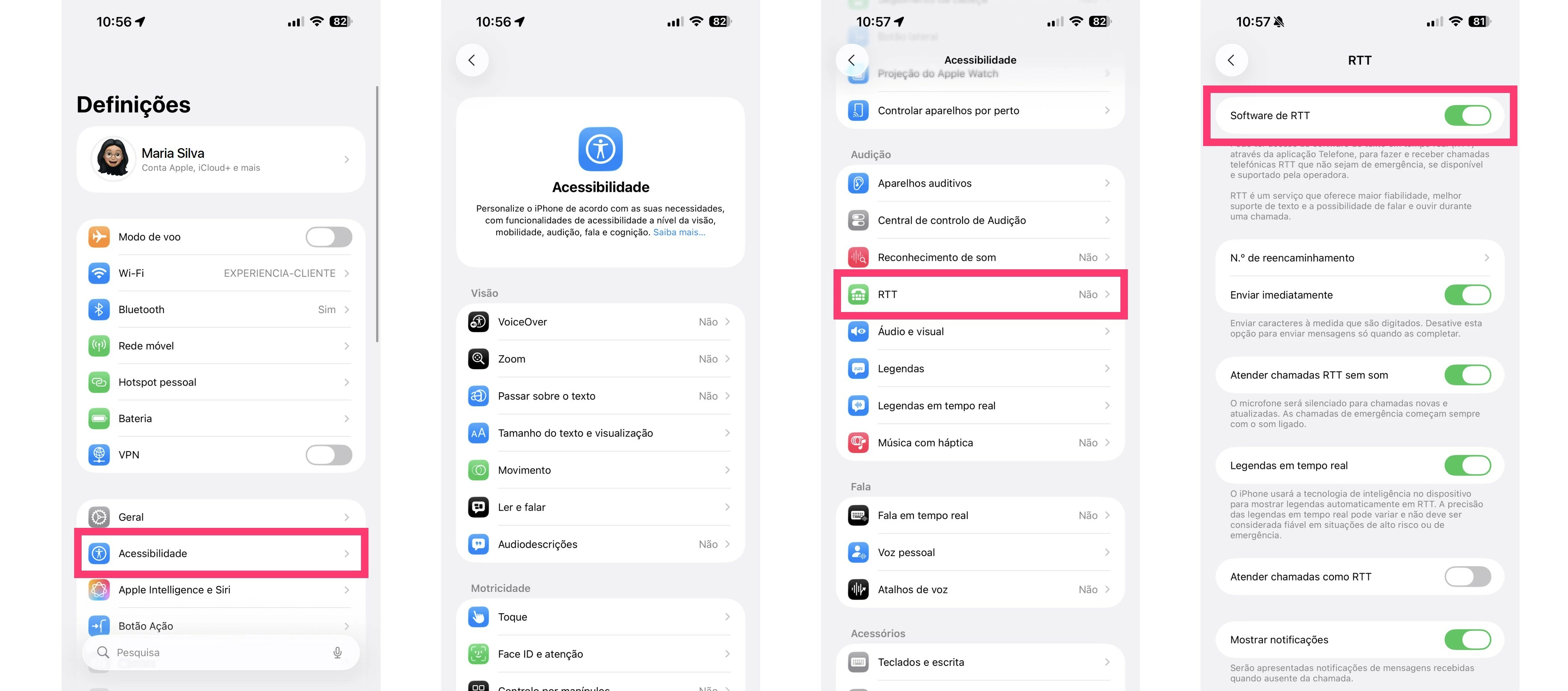 O RTT encontra-se desativado para chamadas de voz e ativo para chamadas de emergência. A forma de ativação pode variar consoante o seu equipamento. Em baixo apresentamos alguns exemplos de ativação.