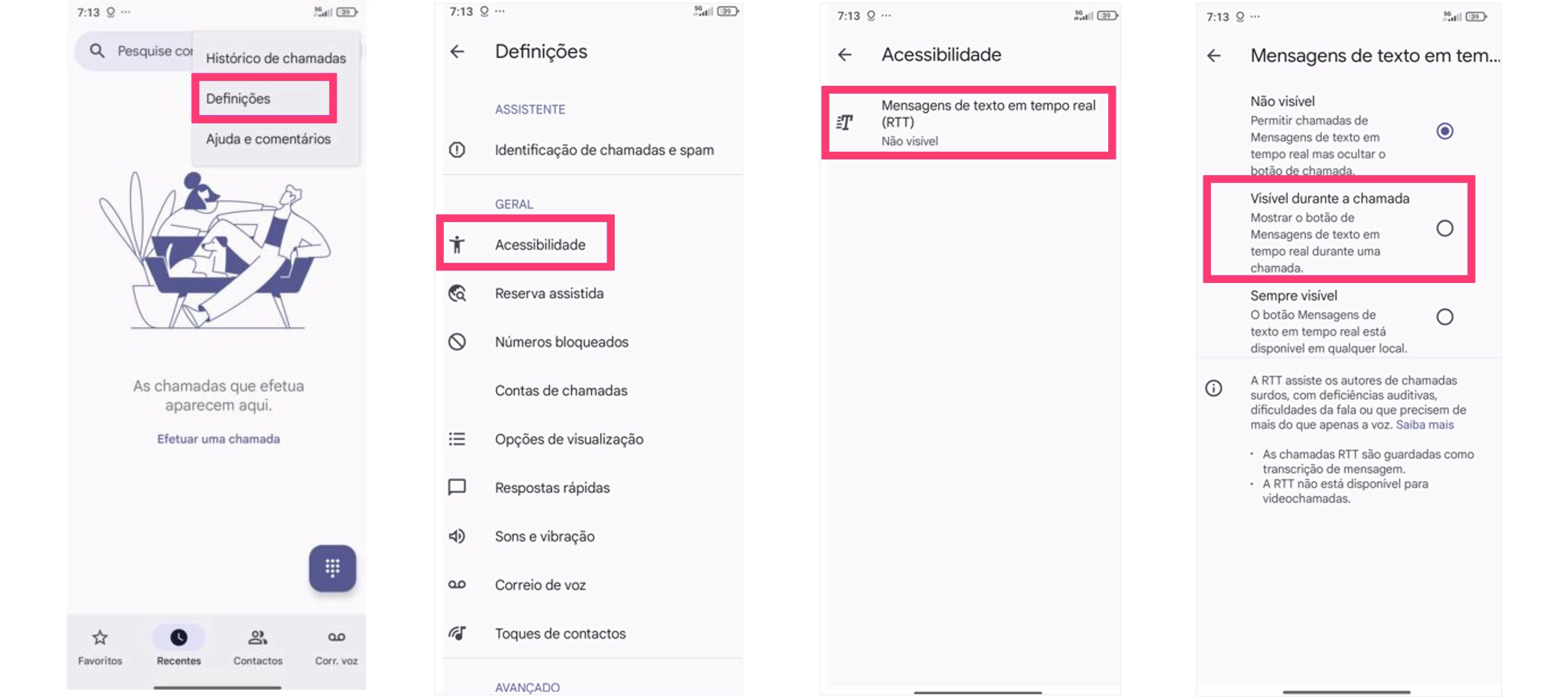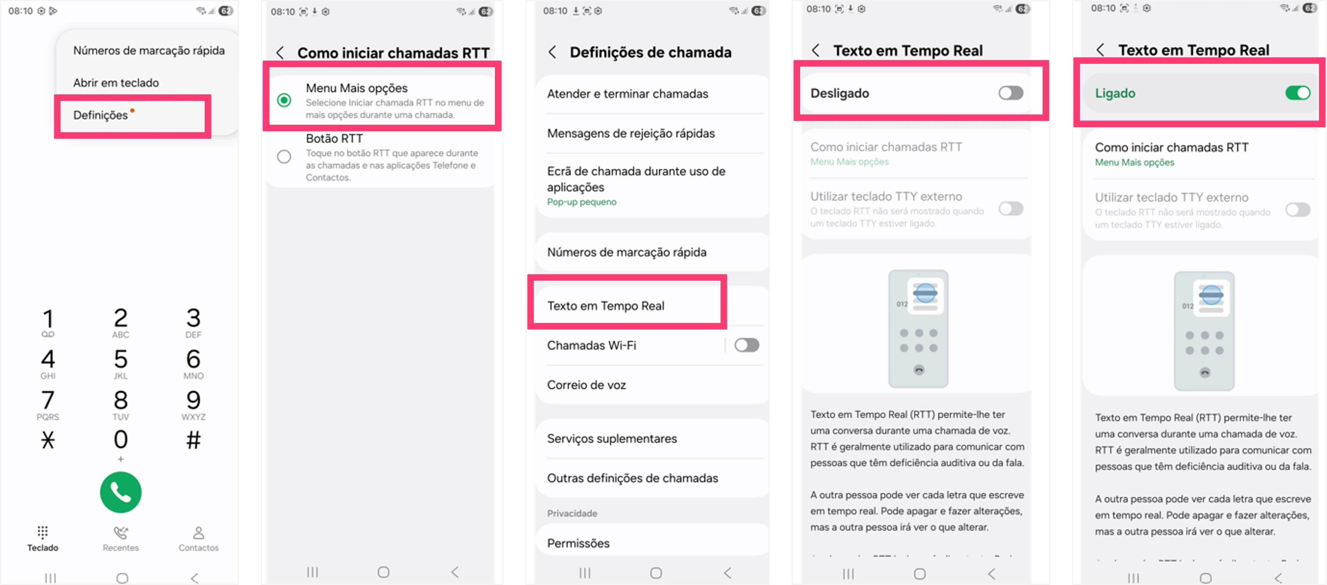 - Aceda a Definições do teclado de chamada → Acessibilidade → RTT