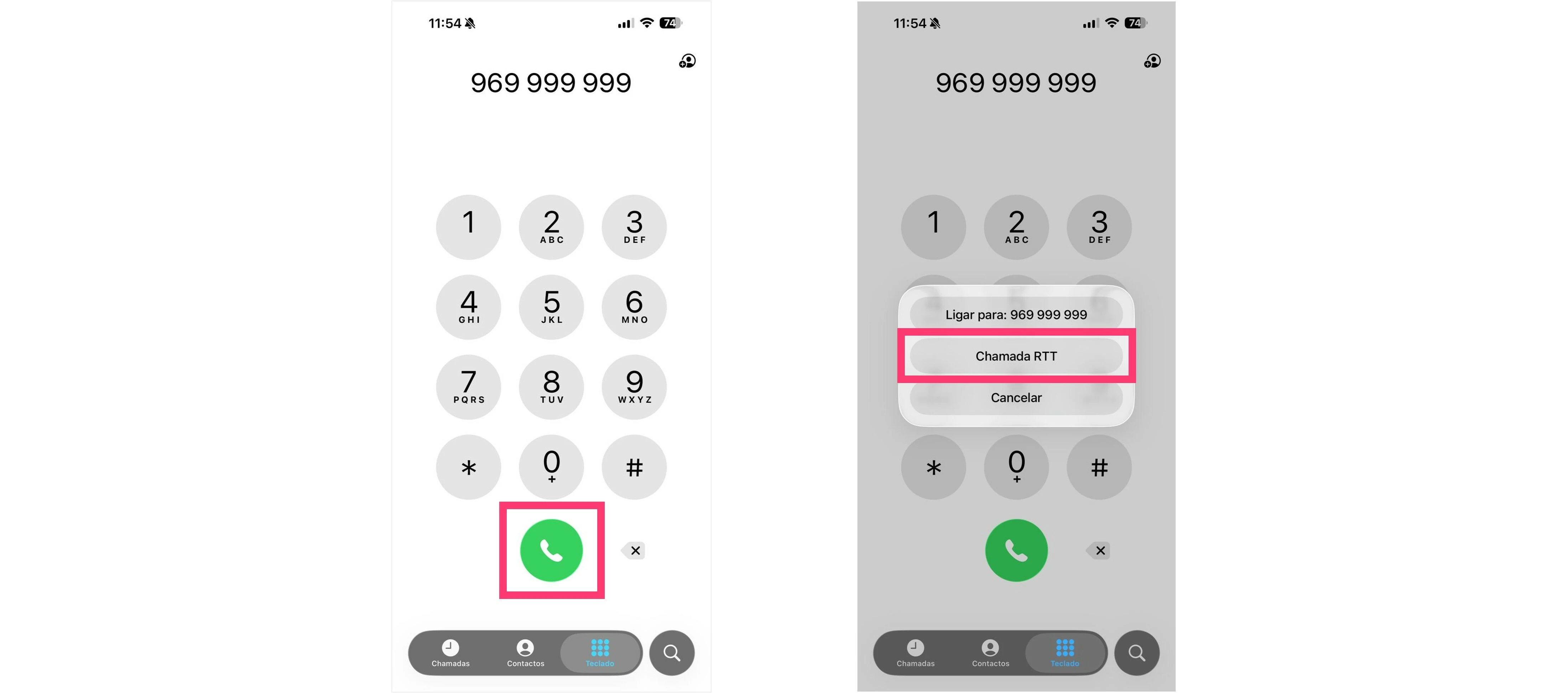 Pode iniciar a chamada diretamente em modo RTT, deve escolher opção de “Chamada RTT”.