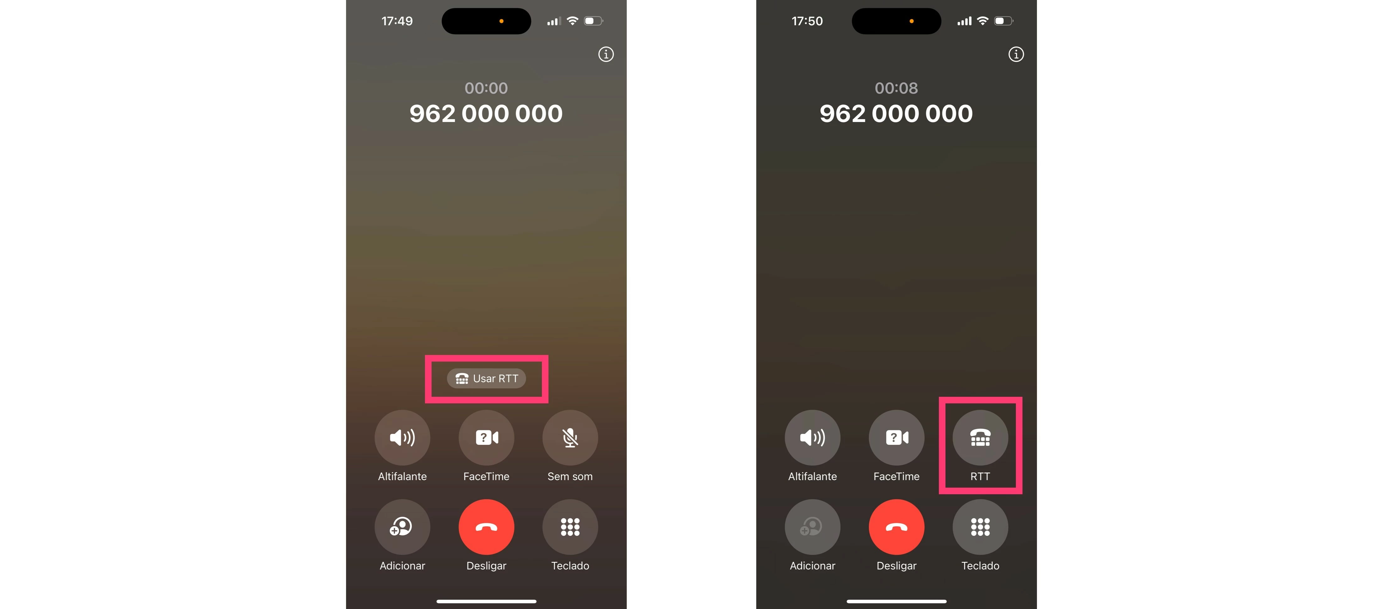 Ou ativar esta funcionalidade durante uma chamada de voz já em curso, deve escolher opção de “Usar RTT” seguido de “RTT”.