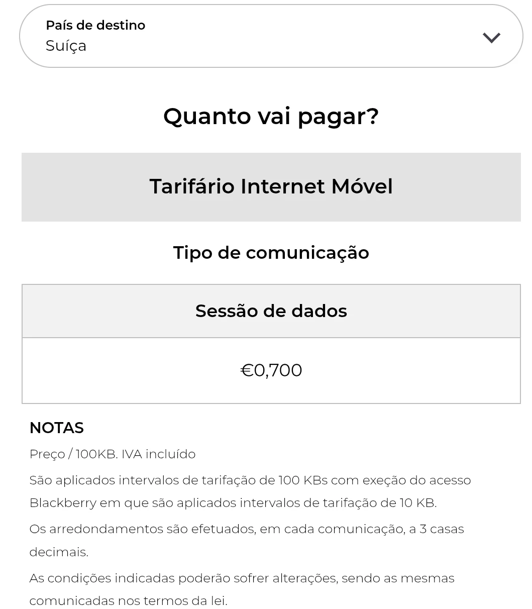 Ativei dados por breves segundos na Suíça sem intenção de utilizar roaming fora da UE. O sistema atingiu imediatamente o limite de 50€, sem utilização significativa. Considero que não houve transparência suficiente sobre a ativação automática de um custo tão elevado. Solicito a revisão e anulação (ou pelo menos crédito) deste valor, dado tratar-se de um consumo involuntário e desproporcional.