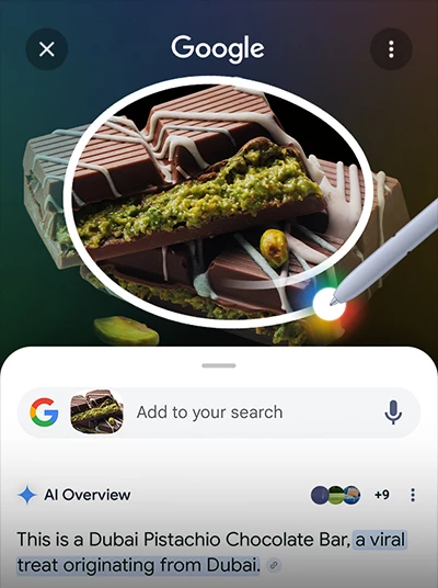 O Circle to Search with Google permite-lhe pesquisar de forma instantânea qualquer coisa no seu ecrã. Basta fazer um círculo à volta de um objeto, incluindo imagens, vídeos ou texto, com o dedo ou a S Pen, e obterá resultados de forma imediata. Até pode pesquisar uma canção que esteja a ouvir no momento sem mudar de aplicação.