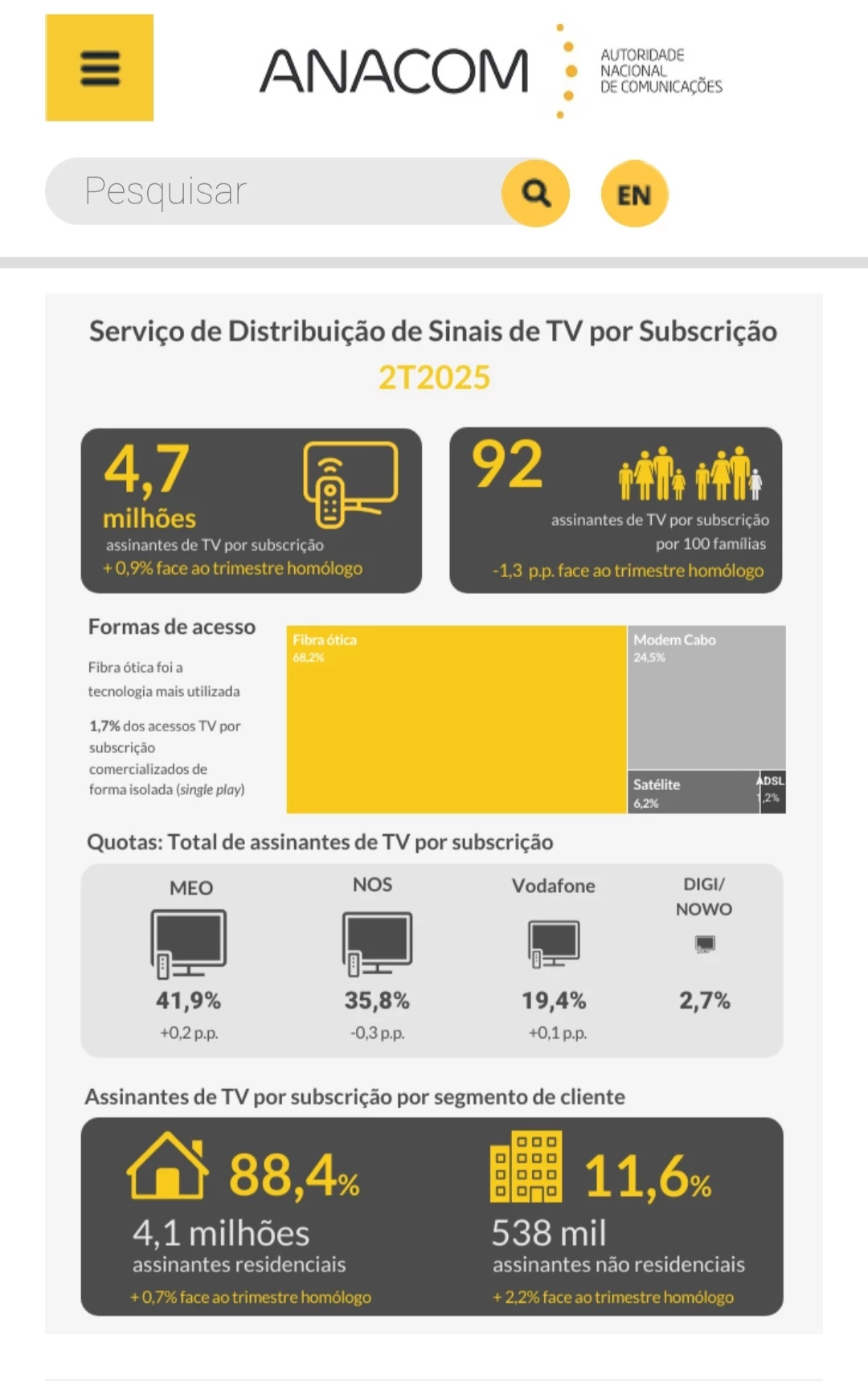 A anacom publicou o número de acesso e as cotas de cada operador nos serviços TV por subscrição e aqui o MEO também ganha para a concorrência.