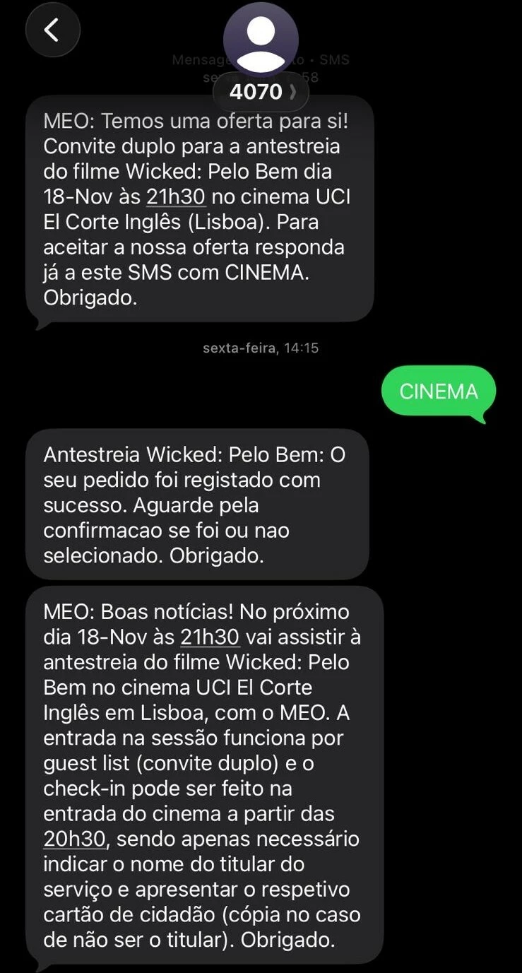 Recebi uma SMS do número 4070 a oferecer bilhetes grátis para a antestreia de Wicked: Pelo Bem, mas não tenho a certeza se é uma mensagem oficial da MEO ou se pode ser fraude/phishing. Podem confirmar, por favor, se esta comunicação é fiável e realmente enviada pela MEO? Obrigado.