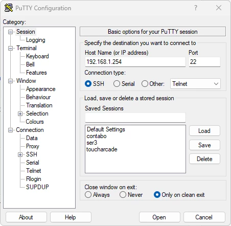 Abrem o PuTTy e colocam o IP do router e escolhem SSH e clicam em Open: