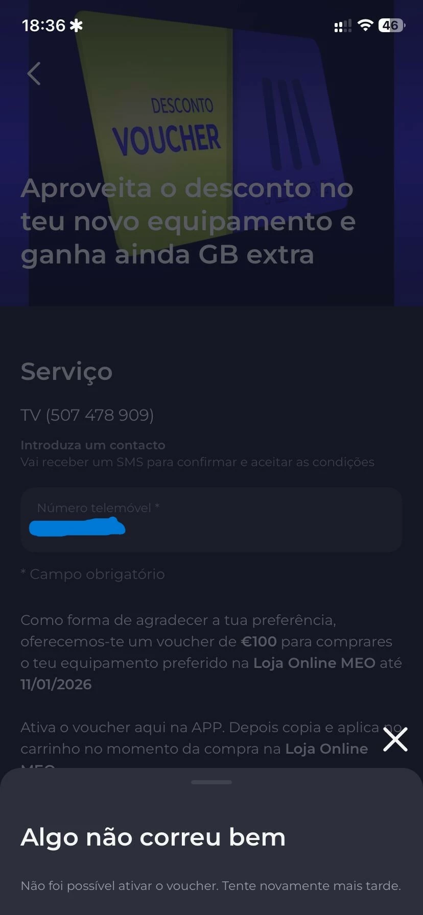 Recebi um voucher de 100€ para utilizar na loja MEO.Mas não estou a conseguir ativar, já tentei várias veres no my meo e dá sempre erro que não é possível ativar .