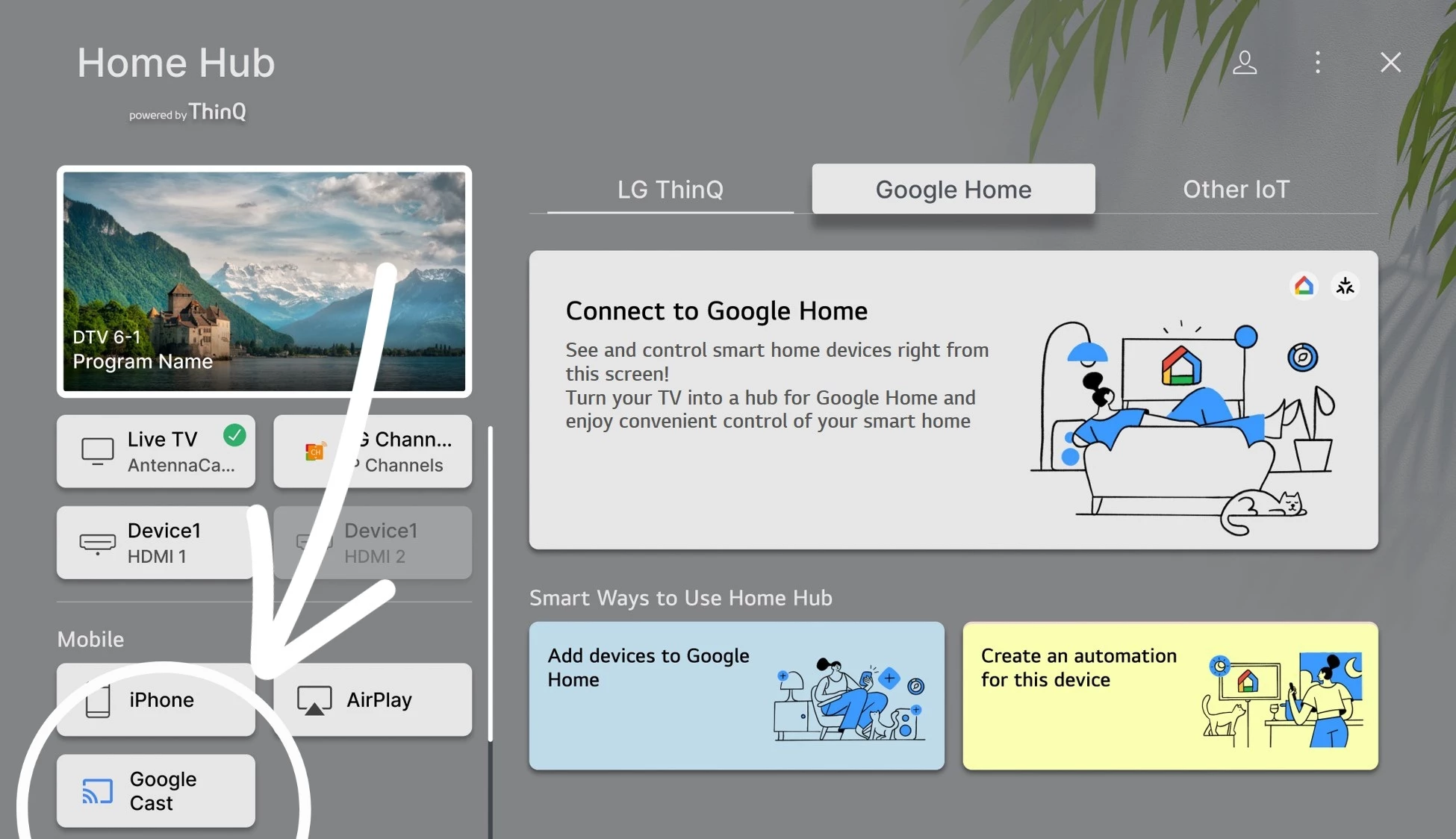 Aceda ao "Painel Casa" na Sua TV (Onde pode Encontrar as Entradas, os Seus Dispositivos Inteligentes, e o seu Telemóvel) aí na Zona "Mobile" ou "Telemóvel" pode Encontrar, e Seleccionar, o "Google Cast" ou "ChromeCast Built-in".
