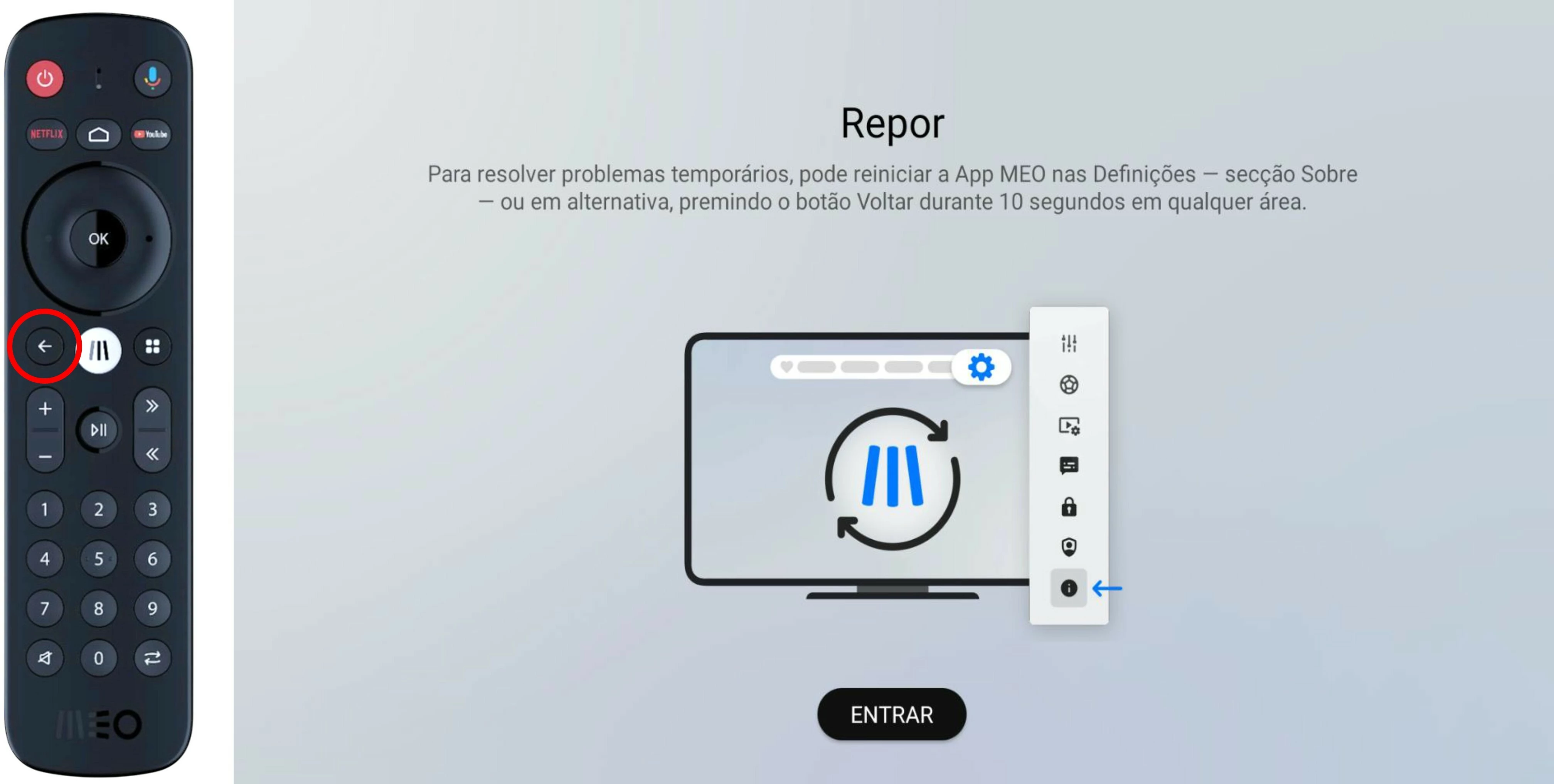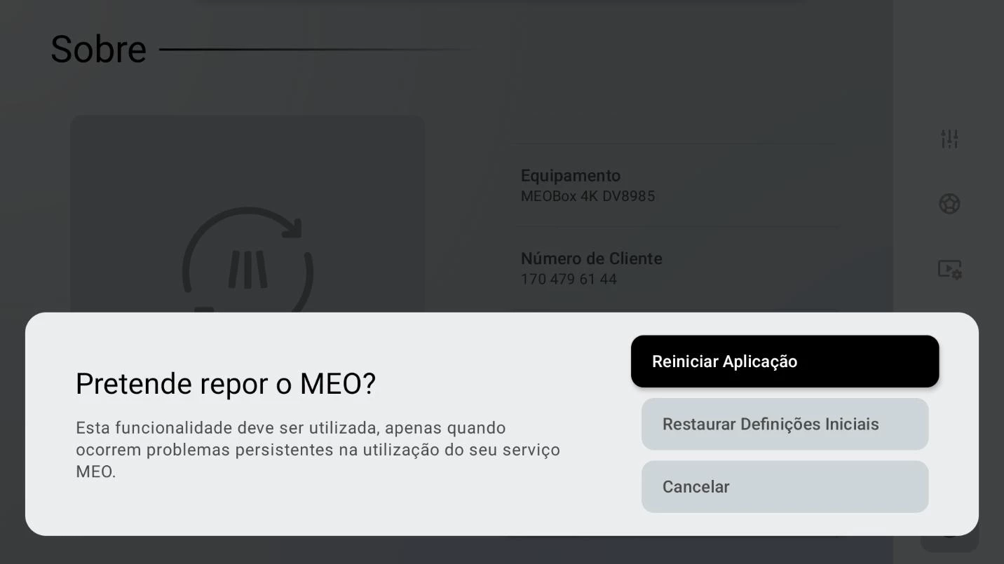 Agora pode repor ou reiniciar a app MEO de forma imediata.