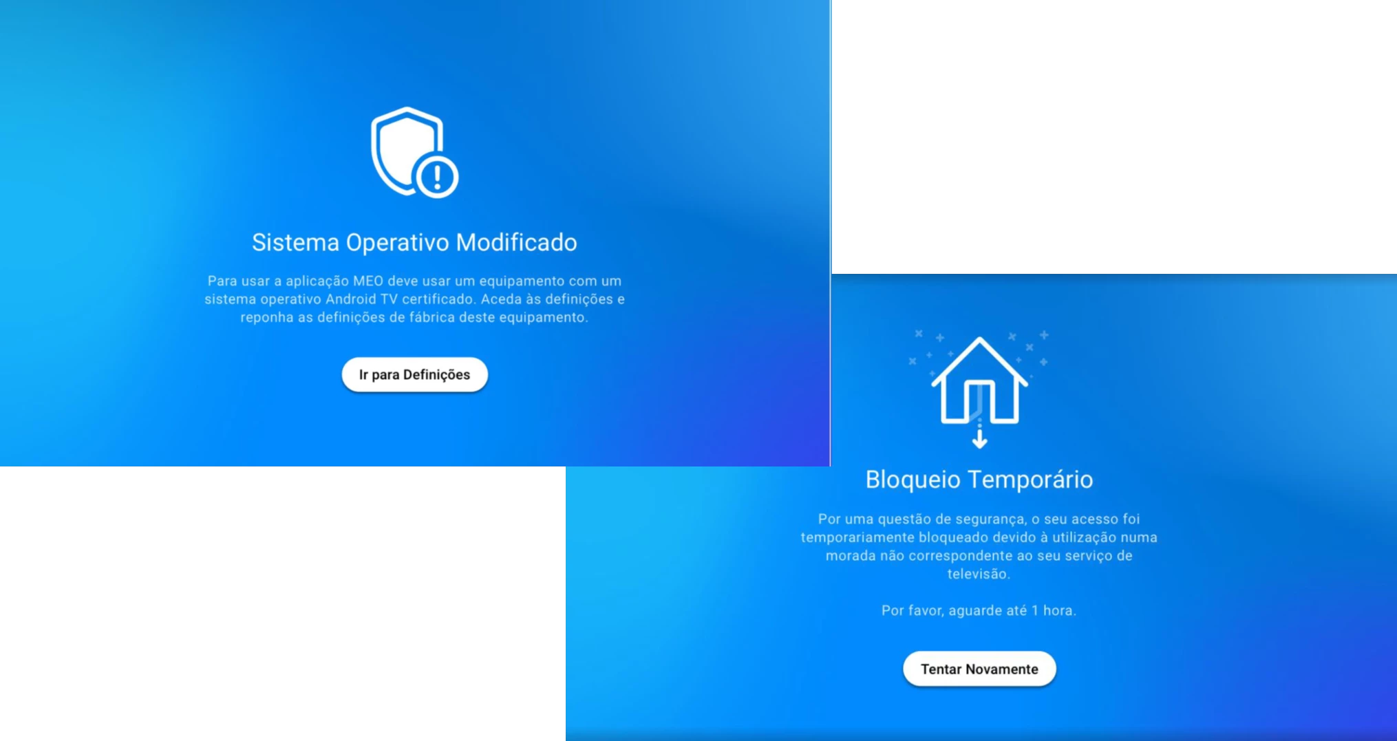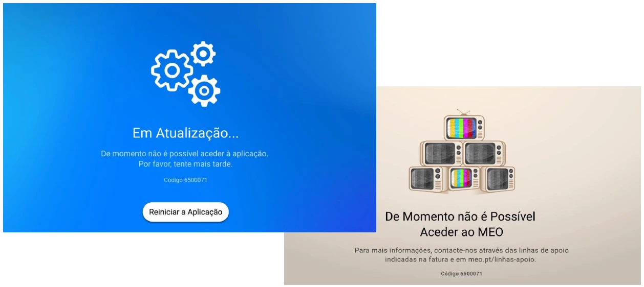 - Erro temporário no acesso aos serviços – ocorre devido a uma falha temporária; a app faz tentativas automáticas de recuperação e, se necessário, reinicia. Caso o problema persista, é indicada a opção de contacto com o apoio ao cliente.